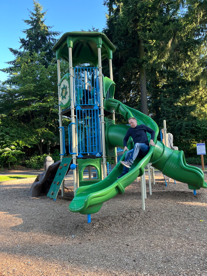 Efter aftensmad på Subway faldt vi alle om kuld ved 19-tiden efter første rejsedag og vågnede ikke overraskende ved 3-tiden om natten helt veludhvilede. Det gode ved USA er, at det meste har åbent de fleste timer i døgnet, så kl. 6 sad vi klar på et af mine yndlingsspisesteder i USA, “Denny’s”, hvor en veloplagt og snakkesaglig tjener sørgede for hot breakfast med bacon, eggs og pancakes i alle afskygninger. Dernæst fulgte en tur i den lokale park med legeplads og søbred, hvor alle fik rørt sig, og vi fik en lille snak med parkbetjent Doug, der var tidligt på færde for at samle skrald, inden dagens gæster, og som gav os et par gode tips til Hawaii.