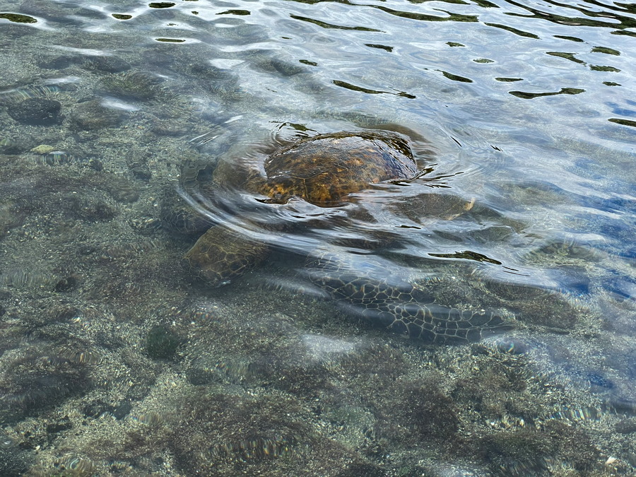Da vi kom tilbage til Kona gik vi til en strand, som er hjemsted for havskildpadder. Her fandt vi adskillige havskildpadder, der hyggede sig på lavt vand, så vi kunne nærstudere dem i ro og mag. Det var endnu en ting, der stod højt på ønskelisten, som kunne tjekkes af.